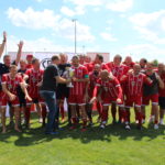 Endgültig perfekt machte die Ü40-Mannschaft das Wochenende für den FC Bayern München. Bereits im Vorjahr hatten die FCB-Senioren den süddeutschen Titel ungeschlagen errungen und wiederholten dies in Bad Mingolsheim in beeindruckender Manier. Nach den beiden Siegen über die SG Stadelhofen/Oberkirch (Südbaden) und die TSG Hofherrnweiler-Unterrombach (Württemberg) war schon nach dem ersten Turniertag klar, dass der Weg zum Meistertitel nur über den FCB führen kann. Mit einem weiteren Dreier über die SG Hoechst Classique (Hessen) machte der Bayerische Meister dann am Sonntag frühzeitig den Titelgewinn klar, ehe er auch im abschließenden Turnierspiel gegen die SG Mingolsheim/Östringen seine weiße Weste wahrte und den Wettbewerb mit einer makellosen Bilanz von vier Siegen ohne Gegentor beendete. Dass auch die Spieler des Ü40-Turniers schon einige Jährchen auf dem Buckel haben, merkte man den Bayern-Spielern bei der Siegerehrung dann nicht mehr an. Nachdem sie die Siegertrophäe aus den Händen von Michael Tittmann (BFV-Spielausschuss) empfangen hatten, hüpften sie ausgelassen und vor Freude singend übers Spielfeld. Lautstark war dabei zu vernehmen, dass sie die nächste Reise zum DFB-Cup nach Berlin führt.