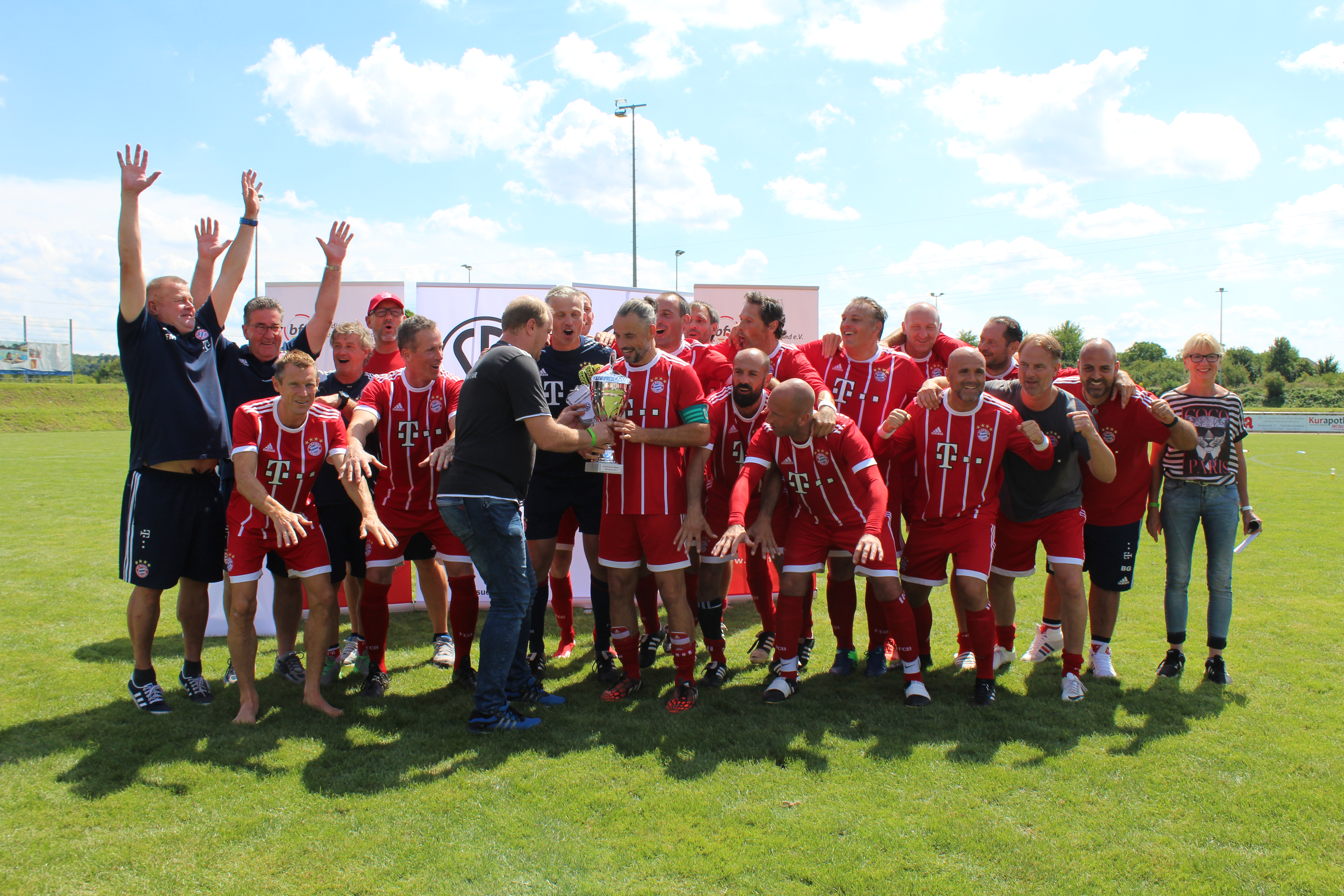 Noch spannender gestaltete sich das Ende der Süddeutschen Ü50-Meisterschaft der Herren. Mit dem FC 09 Überlingen (Südbaden), der AH-SG Darmstadt (Hessen) sowie dem FC Bayern München hatten es gleich drei Mannschaften in ihrer letzten Begegnung in der eigenen Hand, sich die süddeutsche Ü50-Krone des Jahres 2017 aufzusetzen. Die SG Reutlingen (Württemberg) und der TSV Stettfeld hatten zu diesem Zeitpunkt mit der Titelvergabe nichts mehr zu tun. Immerhin sicherte sich der TSV Stettfeld, der mit einem Traktorzug und zahlreichen Fans zum Wettbewerb gekommen war, trotz Abschlussrang 5 zahlreiche Sympathien. Und dadurch, dass der Badische Meister aus Stettfeld dem FC 09 Überlingen im vorletzten Turnierspiel ein torloses Unentschieden abtrotzen konnte, gab es zum Abschluss ein echtes Finale um die Süddeutsche Ü50-Meisterschaft 2017. Groß war die Enttäuschung entsprechend auf Seiten der Überlinger, die das Turnier zwar als einzige Mannschaft ungeschlagen beendeten, den Titelgewinn aber dennoch hauchdünn verpassten. Somit ging es im letzten Turnierspiel zwischen der AH-SG Darmstadt, die als Titelverteidiger angereist war, und dem FC Bayern München um Alles oder Nichts. Der Bayerische Meister benötigte zwingend einen Sieg, wohingegen den Südhessen bereits ein Remis gereicht hätte, um erneut als Sieger aus der Süddeutschen Meisterschaft hervorzugehen.